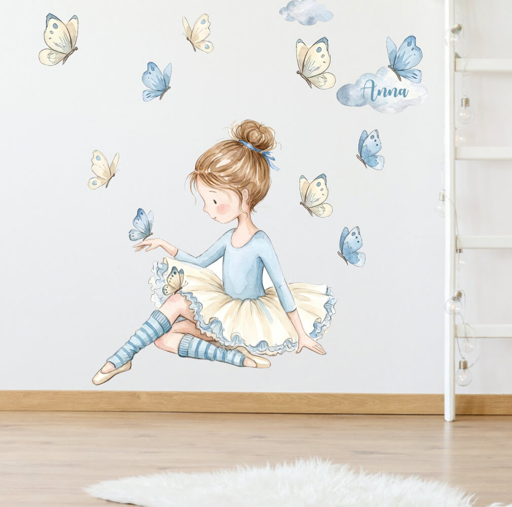 Pastelová nálepka s baletkou, motýľmi a menom pre dievča. Svetlo modré farby vytvoria pokojnú a dievčenskú dekoráciu nad posteľ.