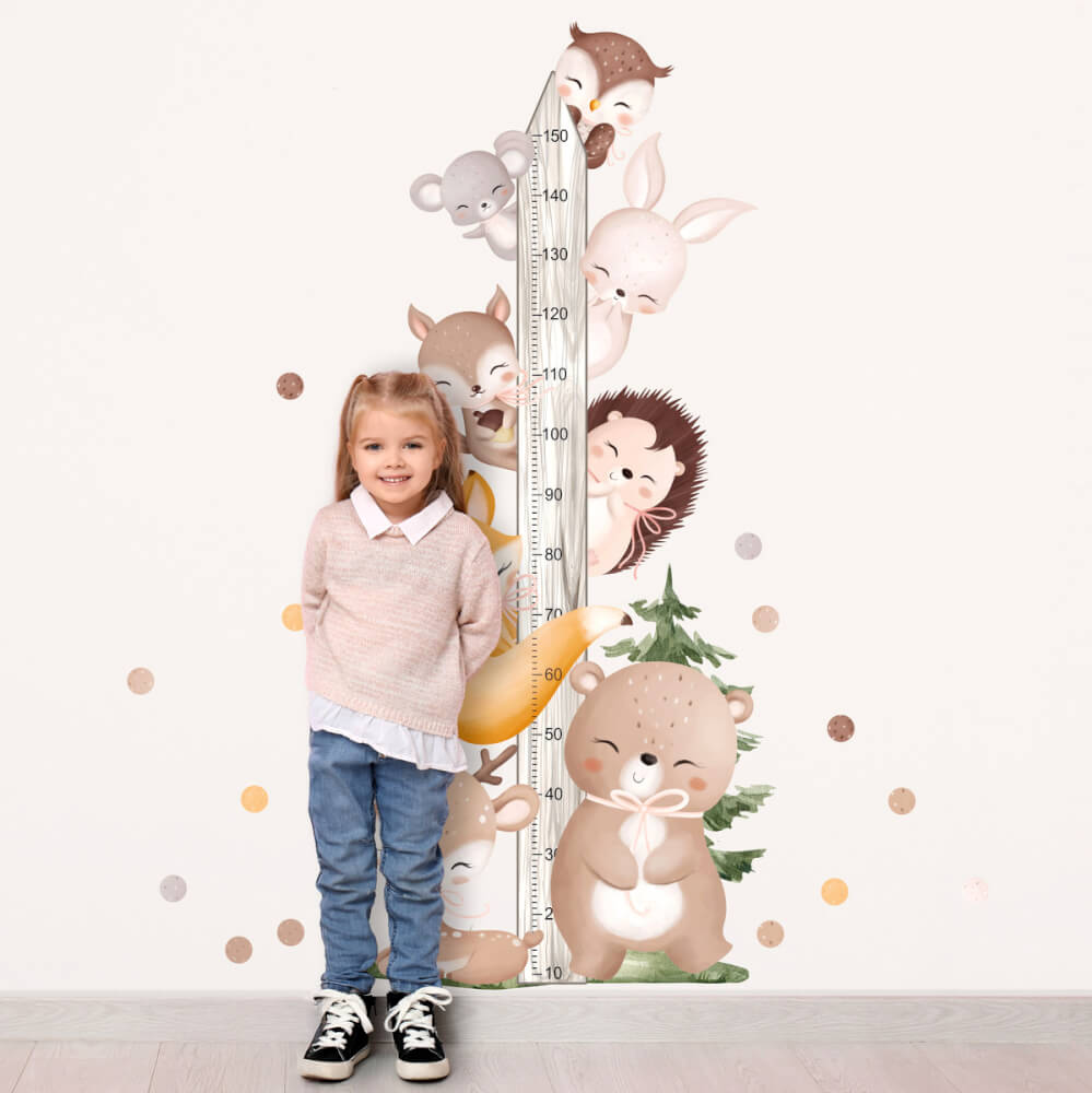 Rastový meter na stenu s motívom lesných zvierat. Praktická a hravá dekorácia do detskej izby.